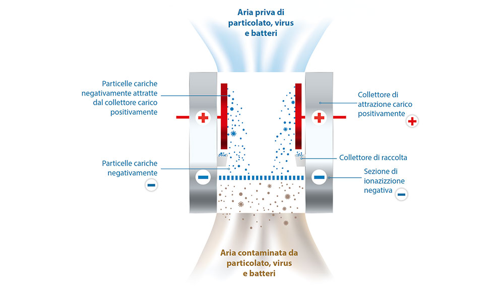 I filtri ESP a causa della ionizzazione ad alta pressione dell’aria creano sempre una percentuale di Ozono, come abbiamo già evidenziato l’ossigeno trivalente crea una forte azione virucida e battericida, nel contempo è pericoloso per la salute umana e la direttiva imposta dell’OMS fissa il limite di 0.1-0.05 ppm negli ambienti chiusi per non creare disturbi alle mucose delle vie respiratorie. La tecnologia innovativa di Medical air pro garantisce, tramite test certificati, una produzione di Ozono inferiore a 0.012 ppm ben al di sotto dei limiti imposti dalla normativa internazionale vigente. Il controllo del livello di Ozono è di tipo adattivo, ossia il microprocessore modula il valore dell’alta tensione di alimentazione della parte ionizzante e captatrice mantenendo basso il suo livello. Questo sistema di modulazione, frutto della nostra tecnologia brevettata, permette anche di evitare corto circuiti o sparks della sezione ESP quando i filtri sono molti sporchi ; un sensore misura il livello di residuo solido raccolto dalle piastre captatrici ed evidenzia sulla console di comando tramite una spia la necessaria manutenzione della macchina.
